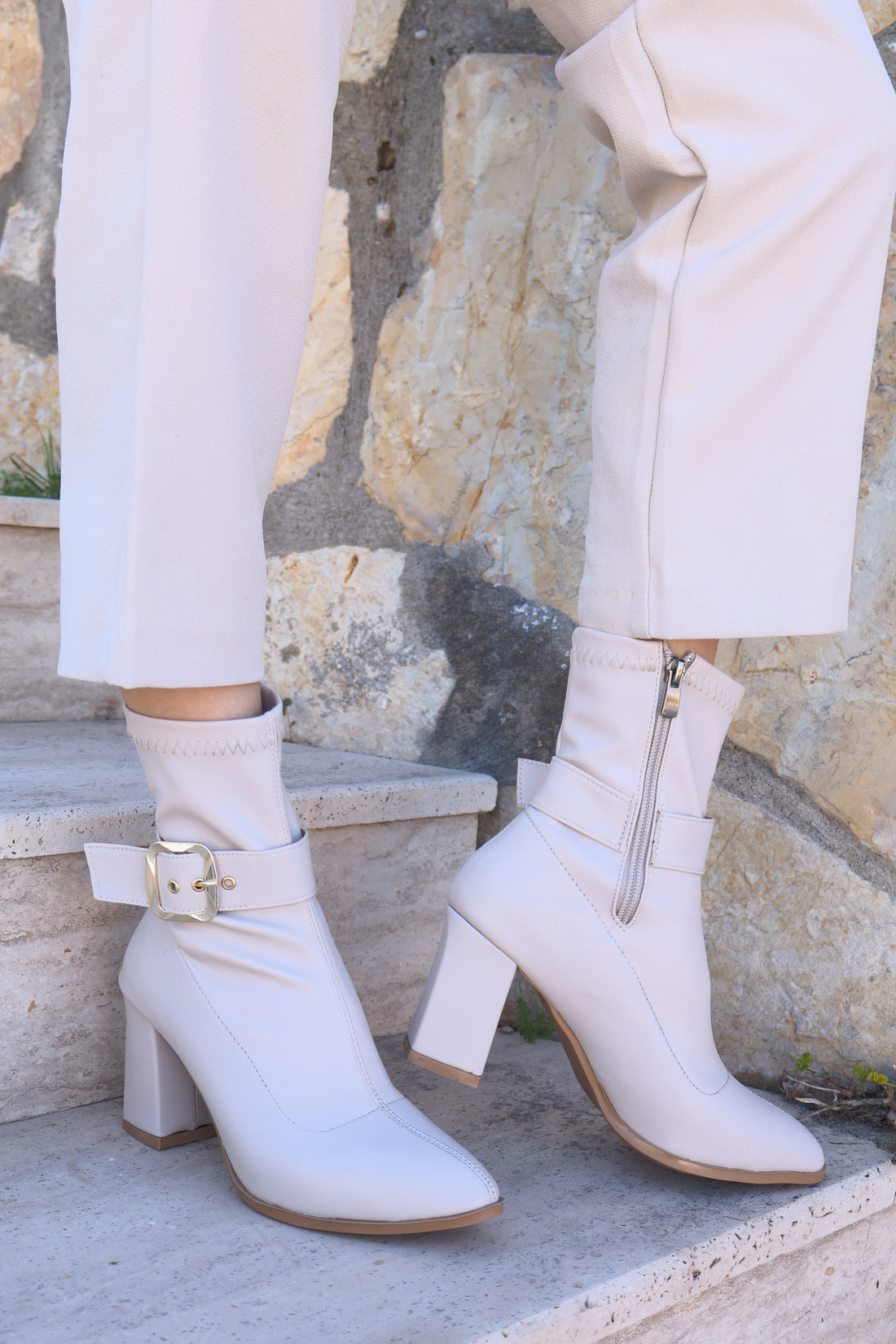 Renyo Kalın Topuklu Streç Tokalı Bej Bot