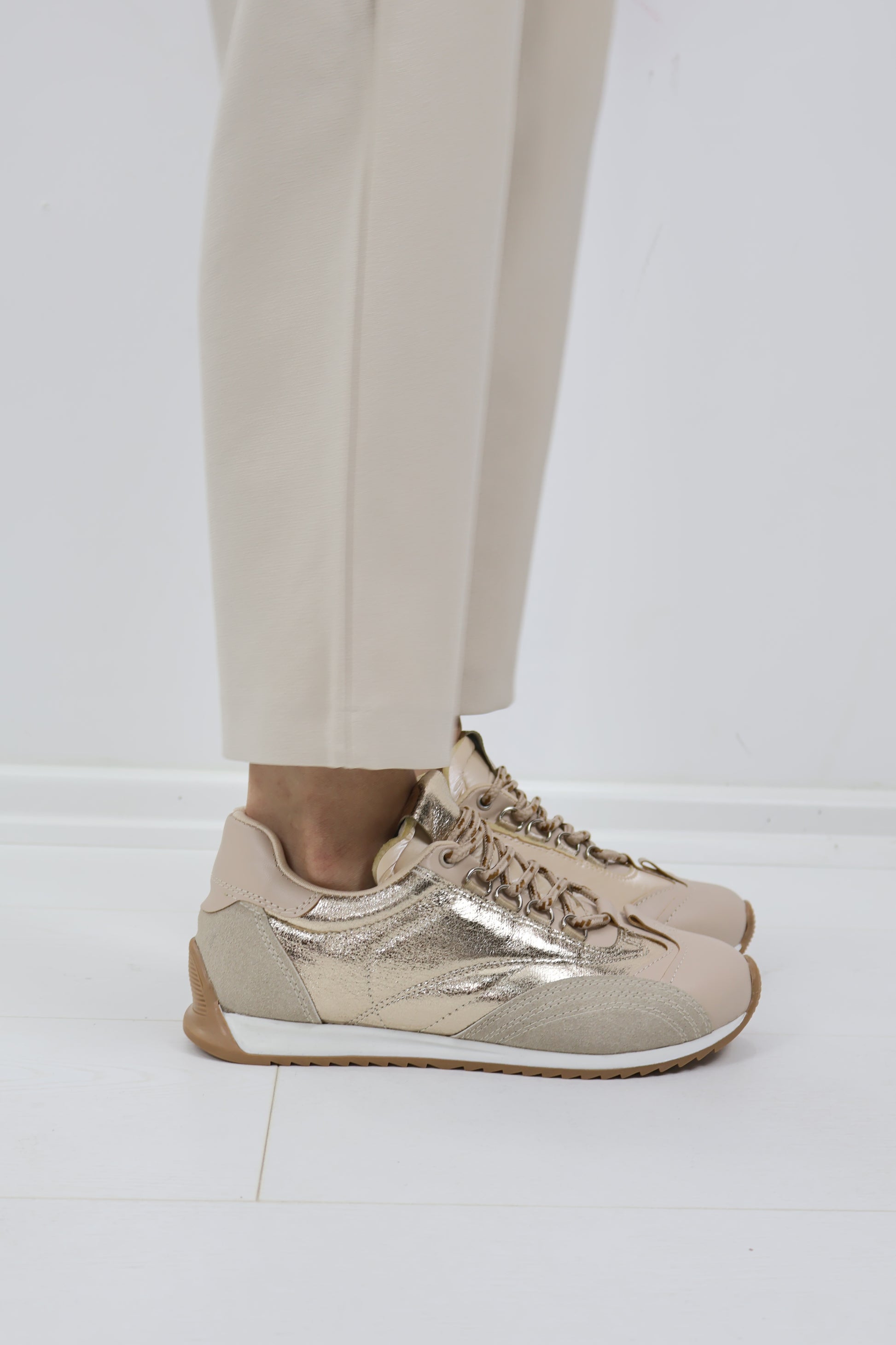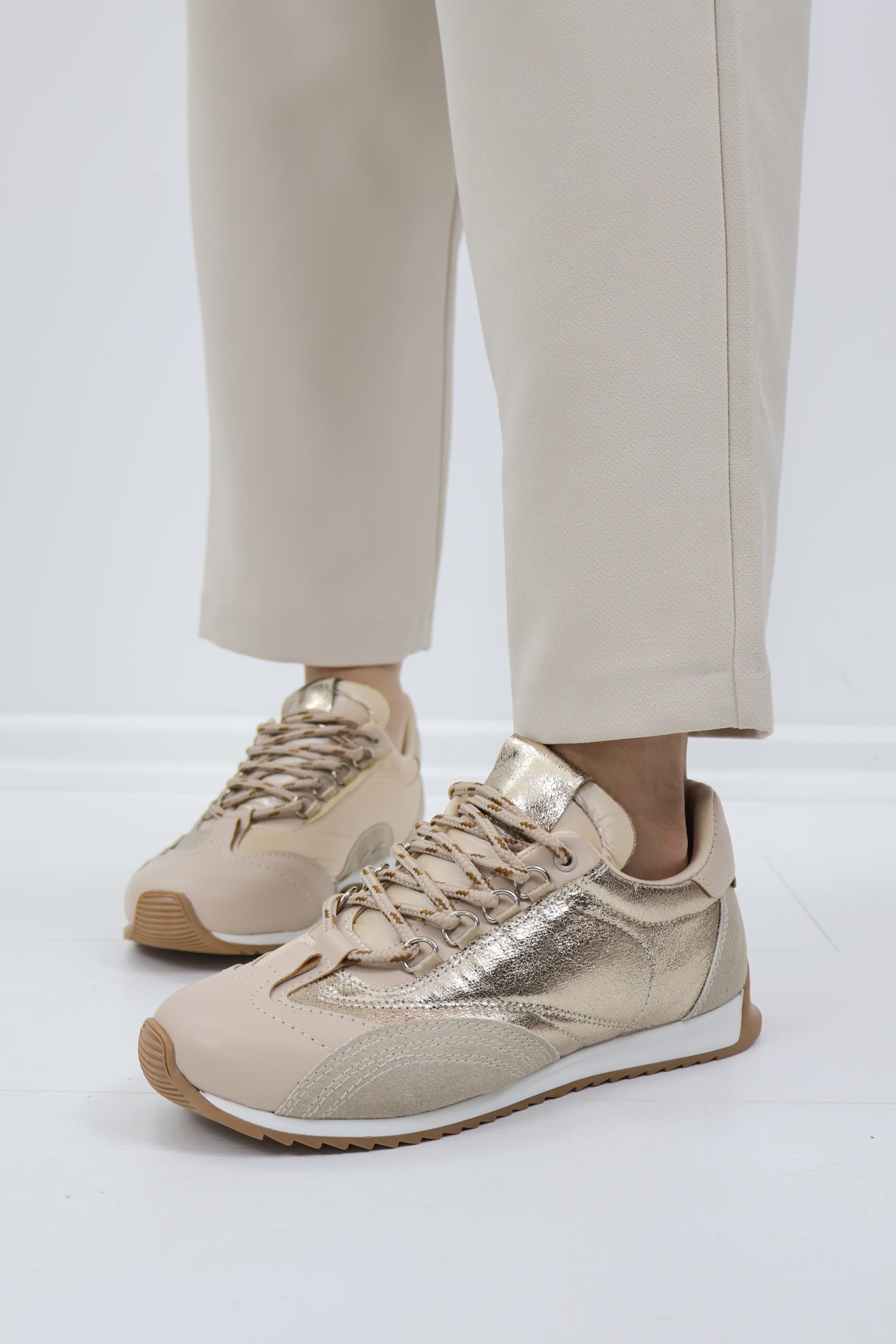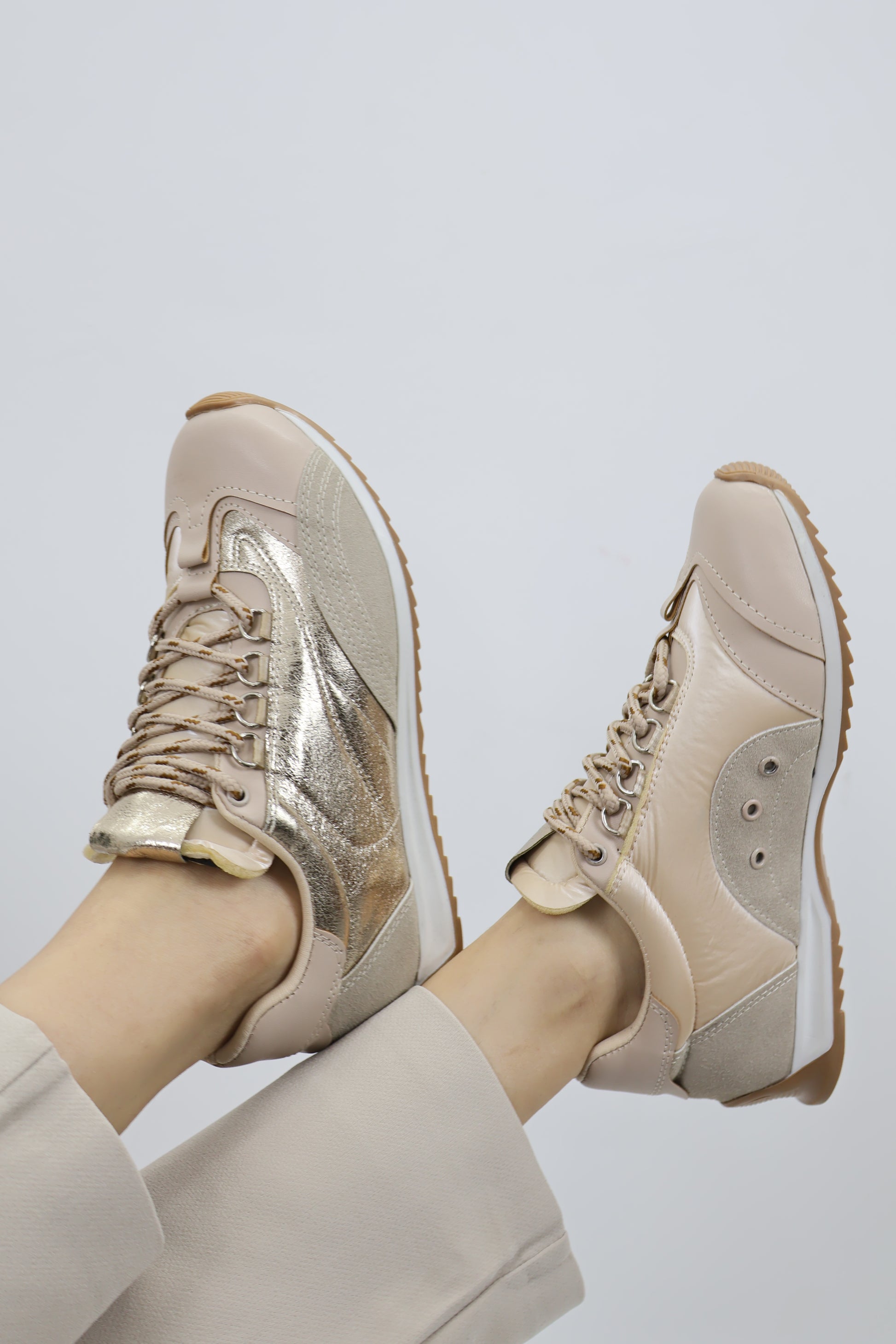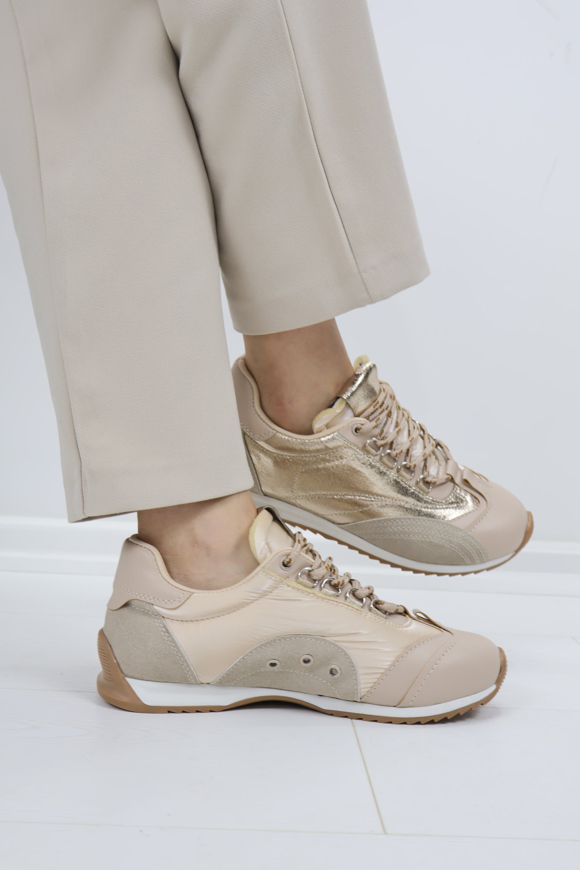 Bej rengindeki bu spor ayakkabı, suni deri ve tekstil karışımı ile dayanıklılık sunar. Gümüş metalik şeritler modern bir dokunuş katarken, rahat yürüyüş tabanı günlük kullanım için ideal konfor sağlar. Bağcıklı tasarım ve tam kalıp yapısı, aktif yaşam tarzına mükemmel uyum gösterir. Günlük aktiviteleriniz için şık ve fonksiyonel bir seçim.